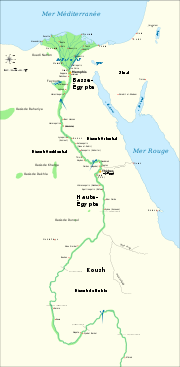 - Jusqu'au -XXXIe siècle : peuplement le long du Nil et période prédynastique. Progressivement se forment deux royaumes rivaux : le Nord (Basse-Égypte) et le Sud (Haute-Égypte).