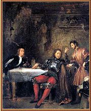 A la demande du duc Louis-Philippe d'Orléans (1775-1850), Delacroix peint un tableau de grande dimension 420x300 cm pour sa galerie historique, au Palais Royal[87]. Il s'agit de Richelieu disant sa messe (1828) ou Le Cardinal de Richelieu dans sa chapelle au Palais-Royal, détruit durant La Révolution de 1848 et dont il ne reste qu'une lithographie de Ligny figurant dans l'Histoire du Palais Royal par Jean Vatout (1830?) [88].