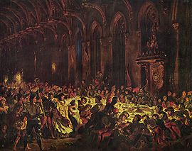 En janvier, il le sollicite de nouveau pour un autre tableau[89] inspiré de Walter Scott (1771-1832), l'Assassinat de l'évêque de Liège (Musée du Louvre) , dans un premier temps présenté à la Royal Academy en 1830, ensuite au Salon officiel de 1831 et enfin à l'Exposition Universelle de 1855 à Paris ainsi qu'à celle de Londres en 1862. Une anecdote circule au sujet de ce tableau, concernant une nappe blanche, point capital de cette scène, que Delacroix avait du mal à peindre. En dessinant un soir chez son ami Frédéric Villot (1809-1875), le peintre se serait fixer un ultimatum, en déclarant : «Demain j'attaque cette maudite nappe qui sera pour moi Austerlitz ou Waterloo». Et ce fut Austerlitz [90]. Pour la charpente de la voûte, il s'était inspiré de croquis faits au Palais de justice de Rouen et du vieux hall de Westminster qu'il avait visité durant son séjour à Londres.