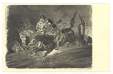 C'est à partir de 1826 que Delacroix fréquente Victor Hugo et son cénacle[72]. Tout d'abord, un premier groupe se forme autour de deux représentants de la littérature officielle : Charles Nodier et Alexandre Soumet (1788-1845). Ce premier cénacle se réunit dans un premier temps dans l'appartement de Nodier, rue de Provence puis à l'Arsenal où il avait été promu bibliothécaire[73]. Leur intérêt commun pour le Moyen Âge donnera naissance au «style troubadour» : Ingres et Delacroix ont l'un et l'autre réalisés des peintures de petit format dans ce style.