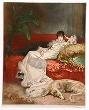 «M. Clairin nous la représente enveloppée dans un long peignoir de satin blanc à queue traînante, elle est étendue sur un riche divan de satin rosé, et accoudée sur un coussin de même étoffe chamarrée d'or ; à sa droite et dans le fond de cet appartement tout oriental, est une glace de Venise entourée de rideaux de velours violet ; à sa gauche une plante tropicale abaisse ses larges feuilles vertes sur l'actrice et sculpteur en méditation ; à ses pieds, un lévrier jaune de grande race repose sur ses longues pattes et allonge sa tête fière et aristocratique[2].»
